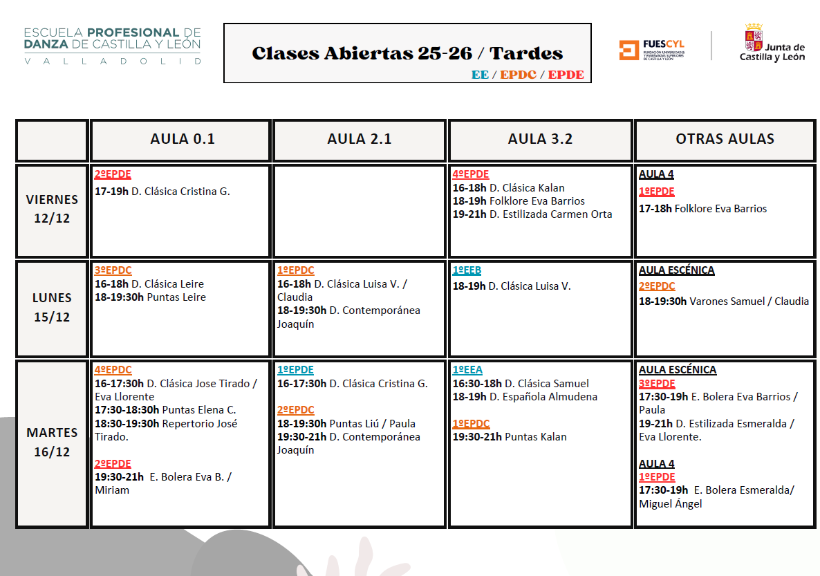 Estos días podréis ver: Enseñanzas Elementales: Danza Clásica, Danza Española y Flamenco. Enseñanzas Profesionales, Especialidad de Danza Clásica: Danza Clásica, Repertorio, Puntas, Técnica de Varones, Danza Contemporánea y el Taller Coreográfico para los cursos de 5º y 6º.Enseñanzas Profesionales, Especialidad de Danza Española: Danza Clásica, Escuela Bolera, Danza Estilizada, Flamenco, Folklore y el Taller de Coreográfico para los cursos de 5º y 6º.