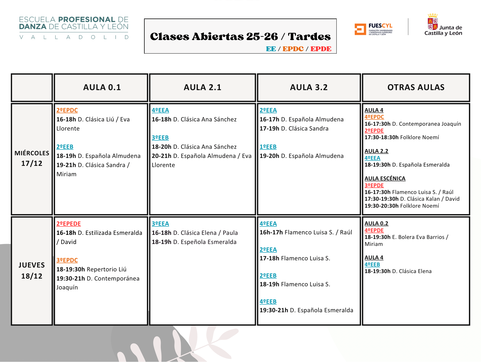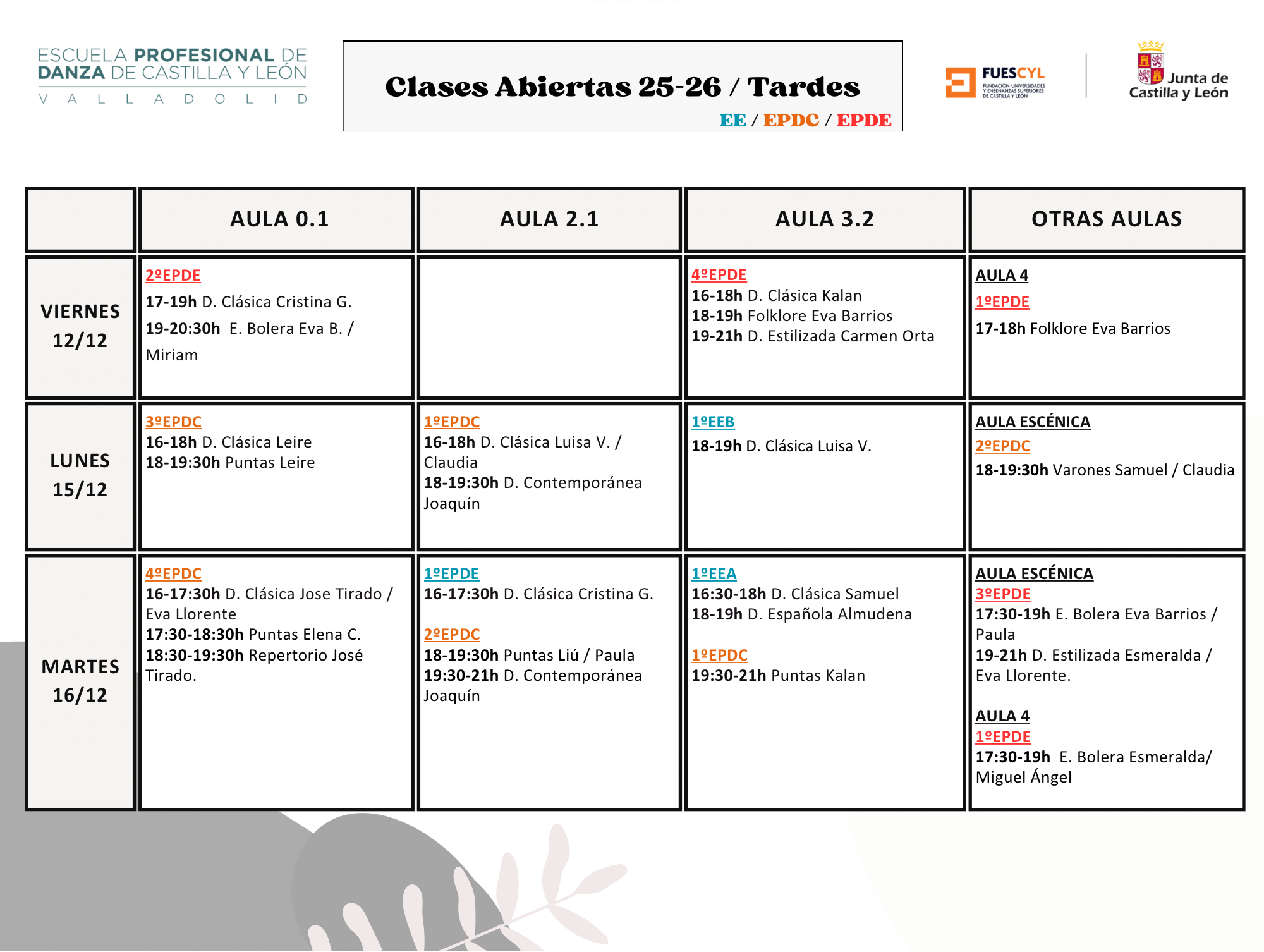 Estos días podréis ver: Enseñanzas Elementales: Danza Clásica, Danza Española y Flamenco. Enseñanzas Profesionales, Especialidad de Danza Clásica: Danza Clásica, Repertorio, Puntas, Técnica de Varones, Danza Contemporánea y el Taller Coreográfico para los cursos de 5º y 6º.Enseñanzas Profesionales, Especialidad de Danza Española: Danza Clásica, Escuela Bolera, Danza Estilizada, Flamenco, Folklore y el Taller de Coreográfico para los cursos de 5º y 6º.