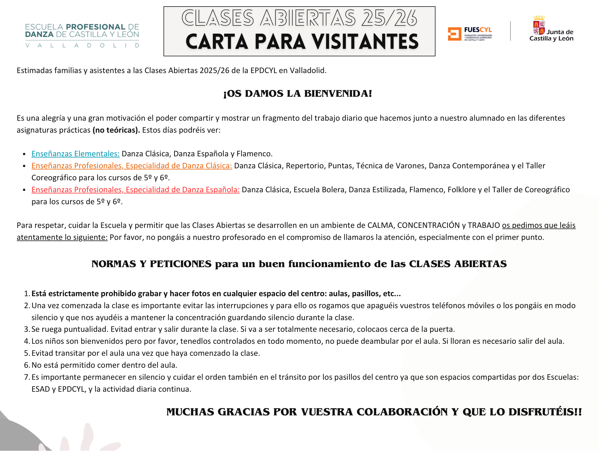 Para respetar, cuidar la Escuela y permitir que las Clases Abiertas se desarrollen en un ambiente de CALMA, CONCENTRACIÓN y TRABAJO os pedimos que leáis atentamente toda la información adjunta.(CLIC EN EL ENLACE)